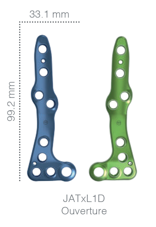• 2 vis décalées au-dessus du foyer d'ostétomie améliorant les caractéristiques mécaniques du montage et permettant d'éviter les pertes angulaires