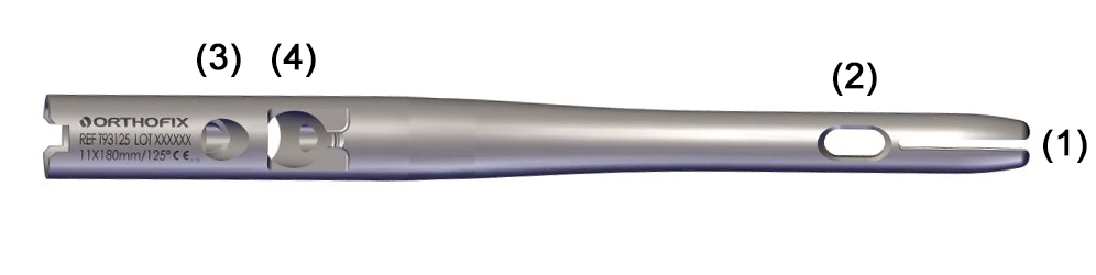 • Orifice pour vis additionnelle anti-rotatoire ou pour un effet anti-rotatoire en per-opératoire à l'aide d'une broche temporaire (3)