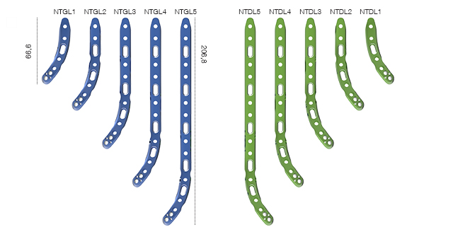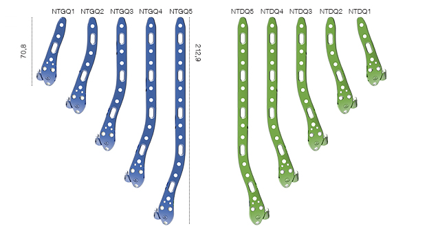 • 3 types de plaques : les médiales en 4 tailles (de 74 à 186 mm), les latérales en 5 tailles (de 67 à 207 mm) et les postéro-latérales en 5 tailles (de 71 à 213 mm).